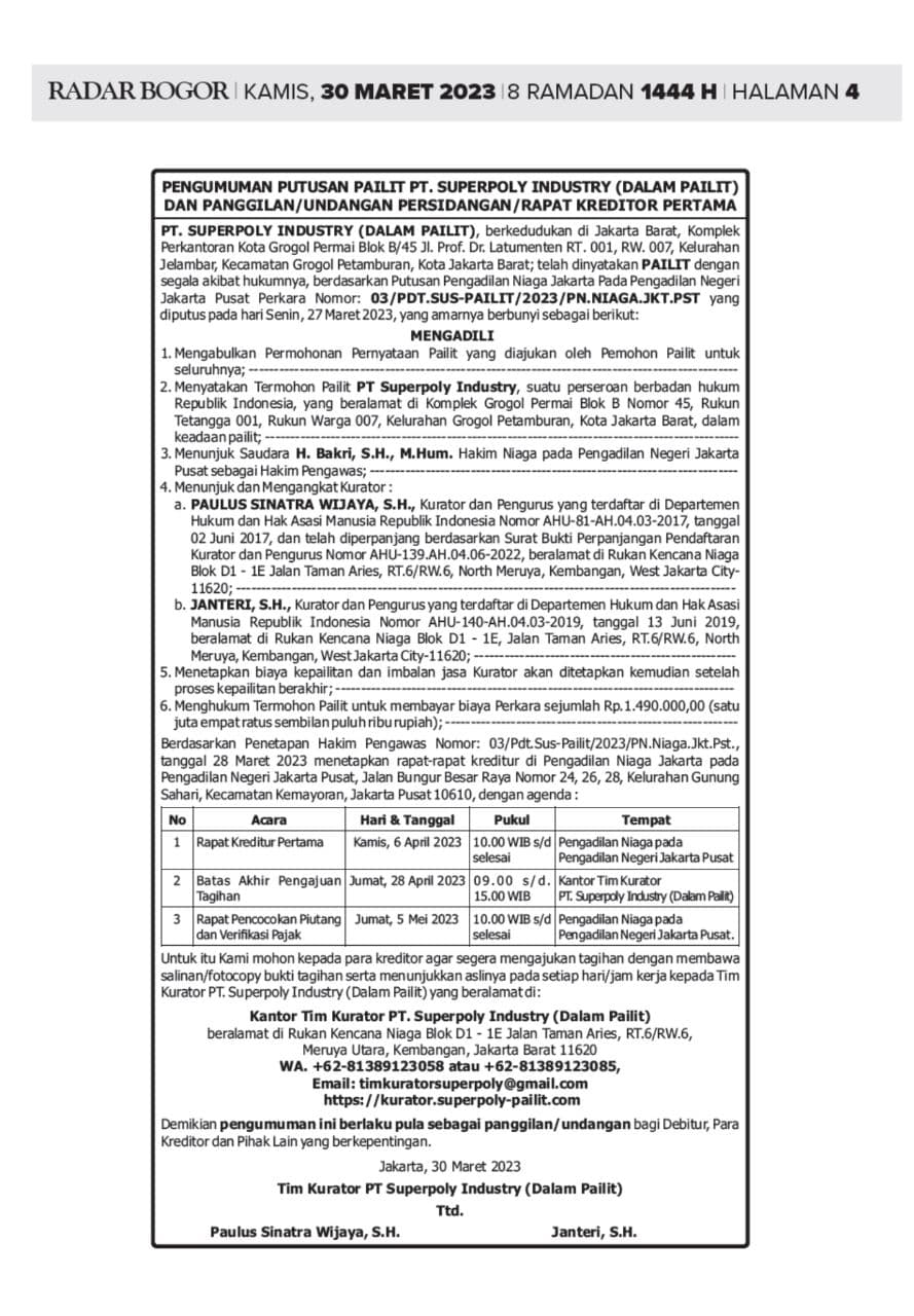 Pengumuman Putusan Pailit PT Superpoly Industry (dalam Pailit) dan Panggilan / Undangan Persidangan / Rapat Kreditor Pertama